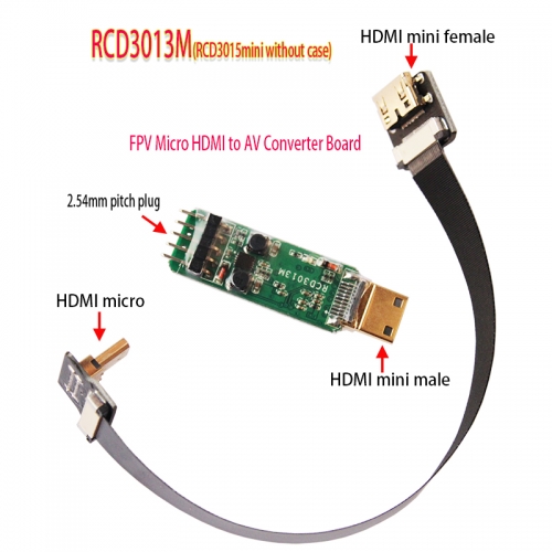 Connect your Sony or GoPro Camera HDMI output through to your FPV Video Transmitter using the RCD 3015 Mini Universal HDMI to AV dongle with Mini HDMI plug. This unit is compatible with SONY NEX-5N, 5R, 5T, 6N, 7N, A5000, A6000 and GoPro3. The converter and leads come in an attractive metal storage box. NOTE: This product supports both PAL and NTSC. Sony NEX series may come in either PAL or NTSC by default, but not both, depended on where you purchased the camera. Unfortunately, it can't be configured/altered by end-user. If your video display is not auto switch (NTSC/PAL), please make sure of your camera video type and choose the correct setting on your monitor. BEFORE using this module, please set the HDMI output mode on your NEX5 to "AUTO", or the module won't work!! Specs: Weight: 3.6g converter, Size (dongle): 48x15x6.13mm Includes: RCD Mini HDMI to AV converter and one HDMI mini female to HDMI micro male cable There are currently no product reviews.